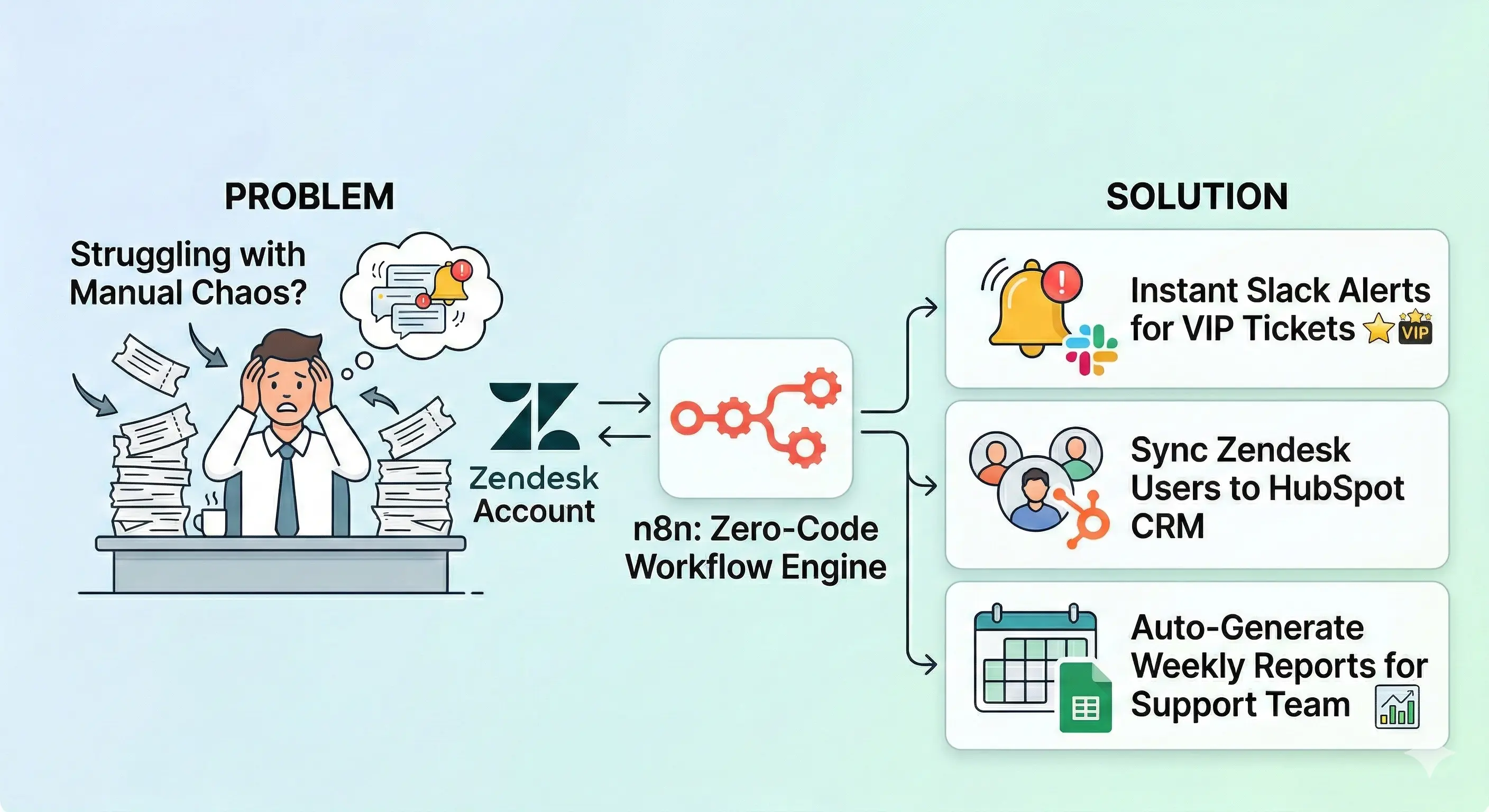 Struggling with manual ticket chaos in yourZendesk account?** This Zendesk n8n tutorial walks you through connecting Zendesk to n8n with zero code. Get instant Slack alerts for VIP tickets, sync Zendesk users to HubSpot CRM, and auto-generate Google Sheets weekly reports for your support team.
